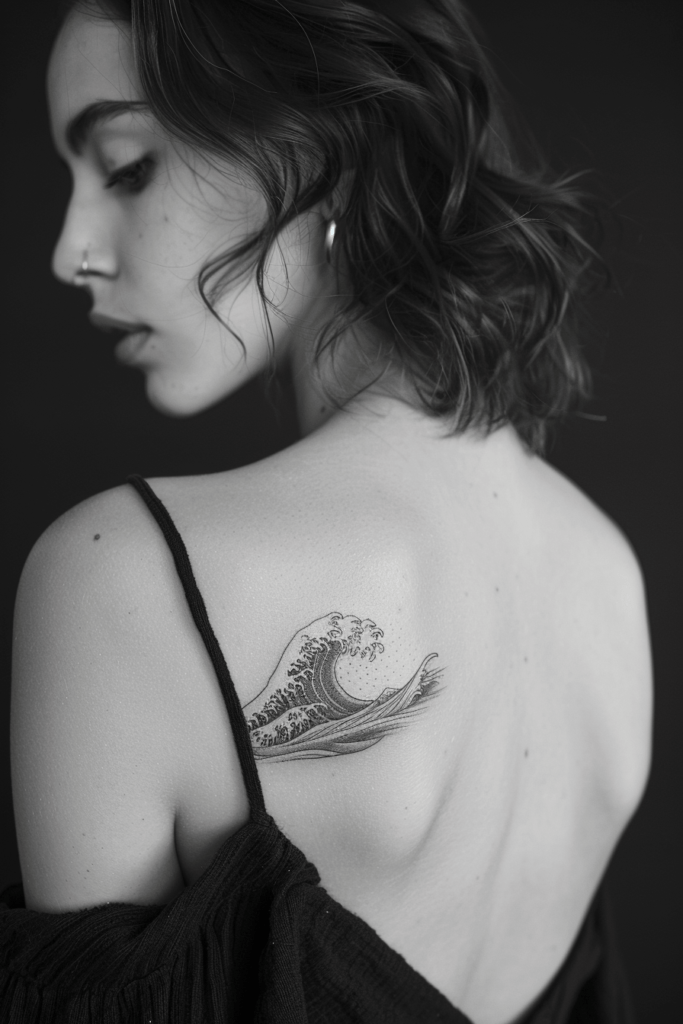 I find this tattoo striking because it symbolizes strength, fluidity, and the power of nature. The shoulder placement makes it a unique and eye-catching choice, perfect for showcasing in sleeveless outfits. This ocean wave tattoo is ideal for those who feel a deep connection to the sea or enjoy the symbolism of water s constant movement and change.