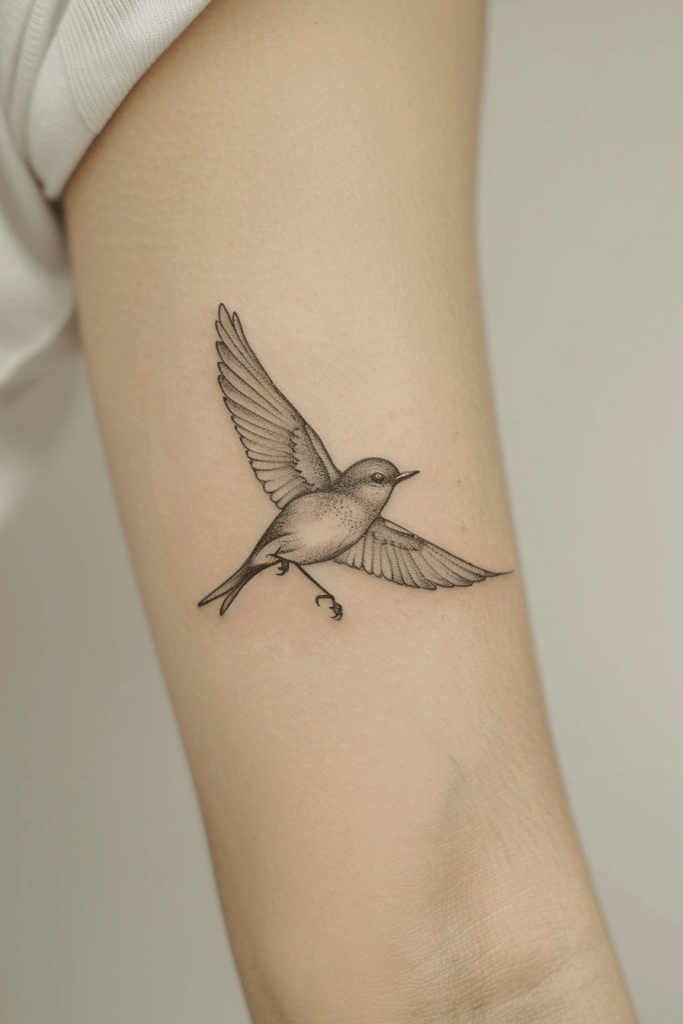 This tattoo shows a delicate bird in mid-flight on the inner arm. The bird s wings are spread wide, and its body is detailed with fine lines and subtle shading. This gives the tattoo a lifelike and graceful appearance.