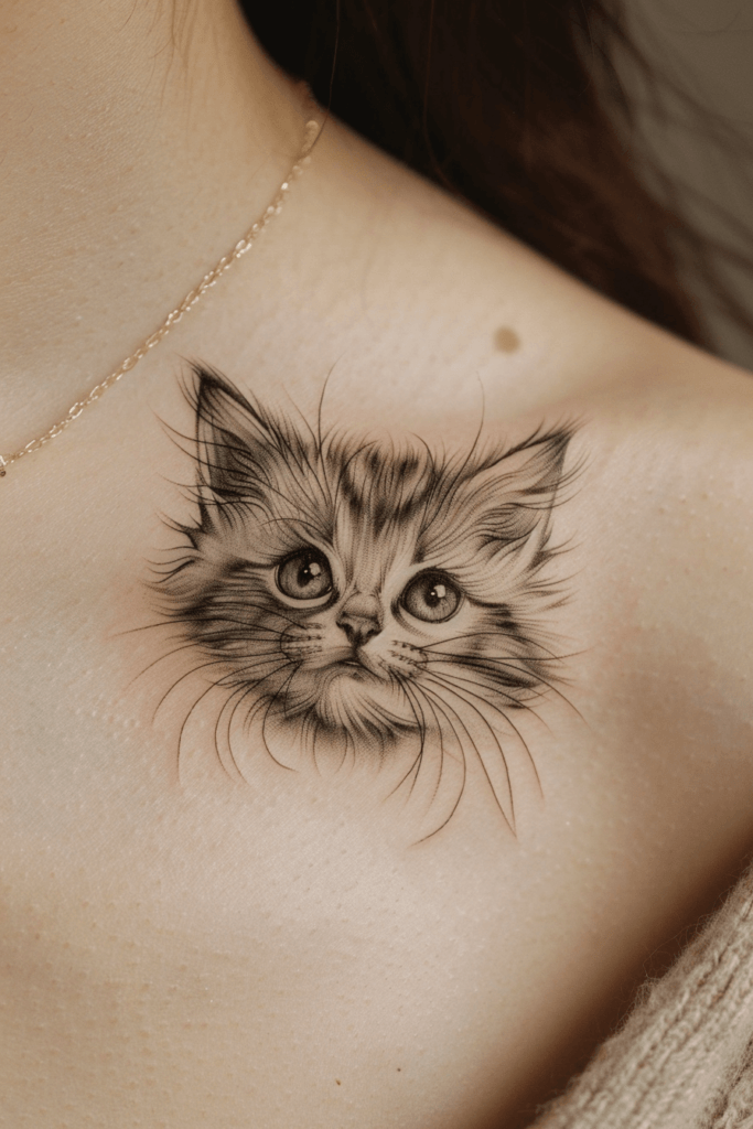 This charming tattoo showcases a detailed kitten s face on the collarbone. The artist has captured the kitten s wide, expressive eyes and soft, fluffy fur with fine lines and shading. The delicate placement just below the collarbone adds a sweet and tender touch.