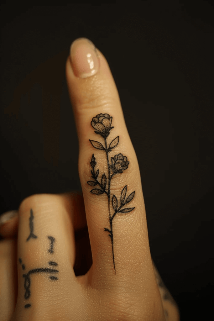 This elegant tattoo features a dainty floral design that wraps around the finger. The intricate lines form two small blossoms with delicate leaves extending along the finger s length. The thin, precise strokes give the tattoo a refined and sophisticated look.