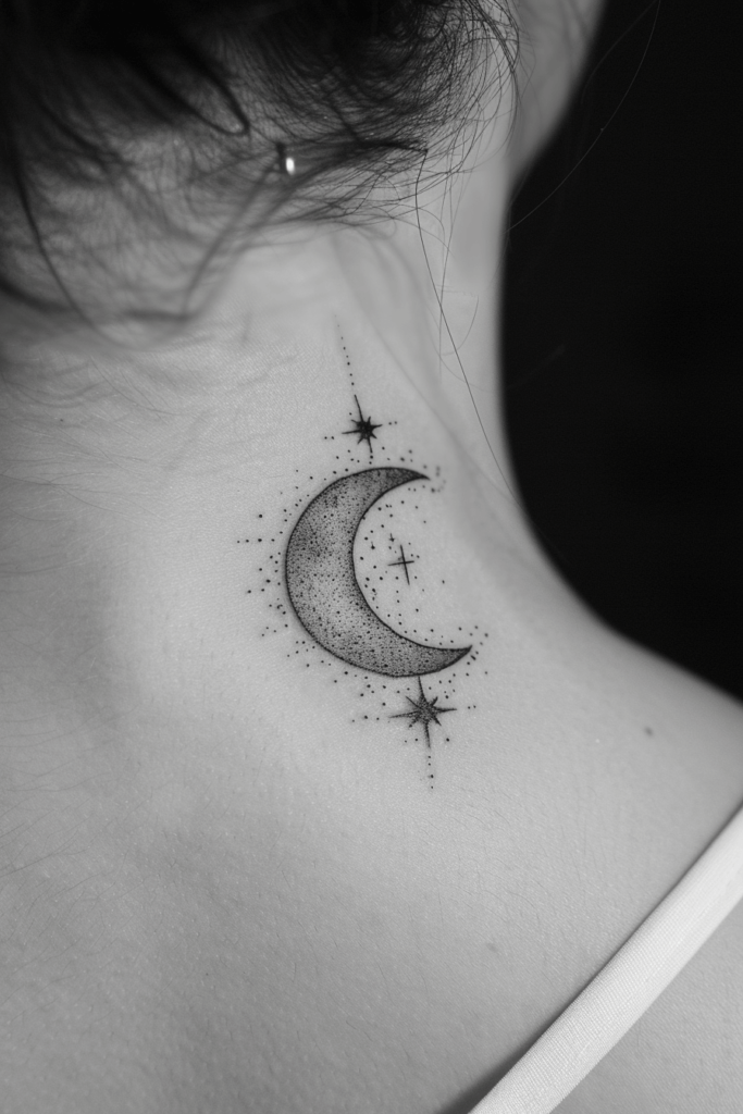 Located at the base of the neck, this tattoo showcases a crescent moon surrounded by small stars. Each star is detailed with fine dot patterns that enhance their twinkling effect. The crescent moon, filled with a gradient of dots, adds depth and texture to the design.