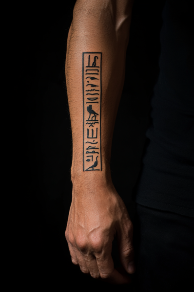 This sleek hieroglyphic tattoo runs along the forearm, making an elegant yet bold statement. The characters are enclosed in a neat rectangular frame, with every symbol precisely etched to reflect the ancient Egyptian script. There s a sense of mystery embedded in the design like you re carrying a coded message from the past, a secret only you and perhaps the gods know. The black ink stands out against the skin, creating a striking and polished look that doesn t overwhelm but certainly captivates.