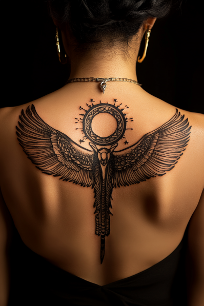 This stunning Winged Sun Disc tattoo spreads beautifully across the upper back, making a statement of celestial power and grace. The tattoo features two wide, elegant wings stretching outward, framing a radiant sun disc adorned with small stars and intricate patterns. The detailing in the feathers is immaculate, giving them a lifelike texture, while the sun disc itself feels mystical and commanding. The entire design has a perfect symmetry that complements the natural curves of the shoulders, creating a harmonious and awe-inspiring effect.