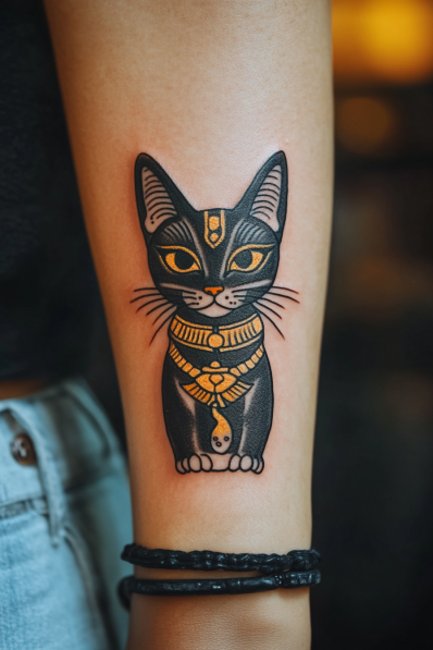 I m totally in love with how this tattoo captures the essence of a protective goddess in such a cute and approachable way. It s the perfect mix of historical and whimsical, ideal for someone who appreciates powerful symbols but also wants to keep things lighthearted. Plus, the golden details really make the whole piece pop! If you re a cat person (or just someone who appreciates a fun yet meaningful tattoo), this little guardian is definitely a winner. It s like having your own mini goddess of joy and protection, right there on your forearm!
