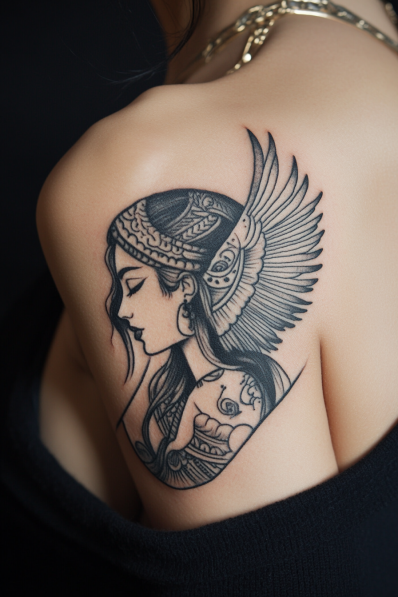 This elegant tattoo of the goddess Isis graces the shoulder with a blend of divine beauty and graceful strength. The design showcases Isis in profile, her serene expression framed by flowing hair and an intricately detailed headdress adorned with traditional Egyptian motifs. Her majestic wing sweeps upward, creating a harmonious flow that complements the natural curve of the shoulder. The fine line work and subtle shading bring out the delicate yet powerful presence of the goddess, capturing her essence as a symbol of healing and protection.