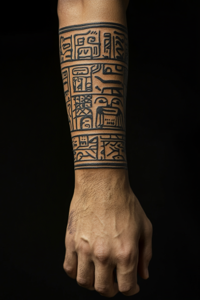 This striking hieroglyphic armband tattoo wraps around the forearm with a pattern full of ancient mystery and cultural depth. The design features rows of hieroglyphs, each symbol meticulously placed to create an intricate yet cohesive band. The bold, black lines give the piece a strong, structured look, while the spacing between the symbols keeps it clean and readable. It s almost like a coded message from ancient Egypt, etched permanently into the skin for only the wearer to fully understand.
