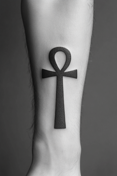 This striking Ankh tattoo stands out with its bold, solid black design. The symbol of life and immortality is brought to life on the skin with crisp, clean lines and an almost mesmerizing matte texture. It s simple yet undeniably powerful, capturing the essence of ancient Egyptian culture with a modern twist. There s something about the way it sits perfectly balanced, giving off major I know what I m about energy.