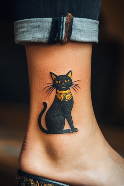 This adorable Bastet cat tattoo sits gracefully on the ankle, exuding both elegance and charm. The sleek black feline is detailed with golden eyes and a beautifully ornate gold collar, a nod to its divine status in ancient Egyptian mythology. The cat s posture, with its tail curled and head held high, gives off a vibe that s equal parts playful and regal. The design is clean and modern while paying homage to the goddess Bastet, protector of home and bringer of joy.