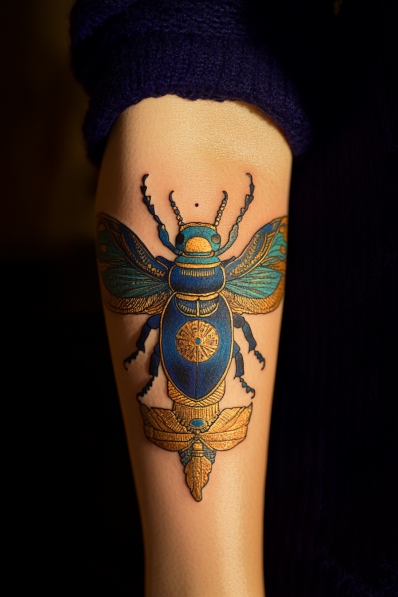 Check out this magnificent scarab beetle tattoo, bursting with rich blues and glistening golds that practically leap off the skin. The ancient symbol of rebirth and protection is given a modern, artistic twist with bold colors and meticulous detailing. The wings are spread wide, revealing ornate, gemstone-like patterns that shimmer with an almost magical glow. The gold accents catch the eye and bring a luxurious, almost royal vibe to the whole design.
