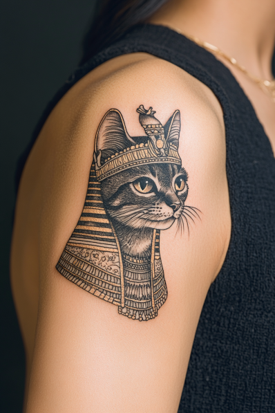 I m completely smitten with how clever and charming this tattoo is! It s the perfect fusion of ancient royalty and feline grace, capturing the spirit of Egypt in a way that feels both modern and fun. If you re a cat lover who also appreciates history, this tattoo is an absolute winner. It s got personality, cultural depth, and a touch of humor because really, what s more regal than a cat who thinks it s a pharaoh? Total purr-fection.