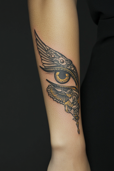 This mesmerizing Winged Eye of Horus tattoo elevates the ancient symbol of protection, health, and power with an exquisite, modern design. The eye is intricately detailed, with golden accents highlighting its mystical allure. Extending from the eye are bold, graceful wings that seem ready to take flight, adding an element of freedom and transcendence to the piece. The tattoo s line work is impeccable, blending traditional and contemporary styles seamlessly, while the gold details give it a regal finish.
