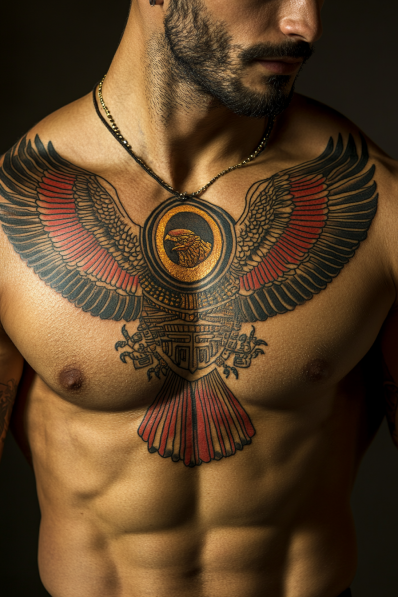 This awe-inspiring Horus falcon tattoo spreads its magnificent wings across the chest, radiating strength and divine energy. The detailed wings stretch from shoulder to shoulder, featuring bold shades of black and deep red that accentuate the god-like presence of Horus. At the center, the falcon s head, enshrined in a golden disc, commands attention, symbolizing protection and power. The intricately designed chest piece is balanced with geometric patterns at the base, adding layers of ancient mystique to the tattoo.