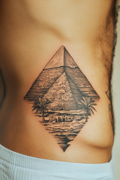 This captivating geometric pyramid tattoo takes you straight to the heart of ancient Egypt. Framed in a diamond shape, the design features a breathtaking scene of the pyramids rising majestically from the desert sands. Palm trees flank the lower section, adding a serene touch, while camels wander through the landscape, pulling you into the mystery and wonder of the past. The shading is expertly done, creating a dreamlike depth that draws your eyes from the base of the design up to the pyramid s peak.