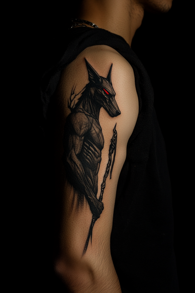 This fierce Anubis tattoo brings the god of the afterlife to life in a menacing and unforgettable way. Depicted with a muscular, humanoid body and the iconic jackal head, Anubis grips a ceremonial staff with a commanding aura. The dark, shadowy details emphasize his otherworldly strength, while the glowing red eyes add a supernatural, almost haunting edge. The design expertly captures the guardian of the underworld s watchful, vigilant nature, wrapping him in an aura of mystery and power.