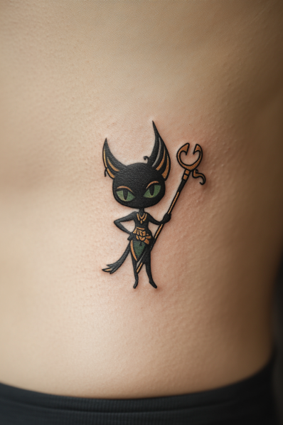 This playful Bastet cartoon tattoo brings a lighthearted twist to the ancient goddess. The design features a sassy, stylized black cat with oversized ears and expressive green eyes, holding a small scepter with authority. The minimalist detailing, highlighted by golden accents on the jewelry and scepter, makes this piece irresistibly cute and full of personality. It s small and simple, yet it packs a lot of character, perfect for a fun and cheeky tattoo that doesn t take itself too seriously.