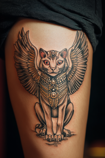 I have to admit, this tattoo is pure genius. It s like having your own mythical guardian cat, fierce and fabulous. The artist did an incredible job merging the elegance of a sphinx cat with the grandeur of Egyptian wings, creating a piece that feels straight out of a legend. If you re looking for something that embodies mystery, protection, and a whole lot of personality, this tattoo definitely checks all the boxes. It s bold, it s beautiful, and let s face it, who wouldn t want a magical, winged cat watching over them?