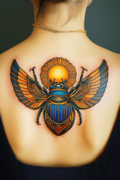 This breathtaking Scarab Beetle tattoo takes center stage on the upper back, bursting with vibrant blues and rich golds that shimmer like an ancient Egyptian treasure. The scarab s outstretched wings are finely detailed, flowing gracefully across the shoulders, while the sun disc above its head glows with radiant energy. The colors are bold and almost iridescent, creating a luminous effect that feels alive and full of power. The whole piece evokes themes of rebirth, transformation, and divine protection.