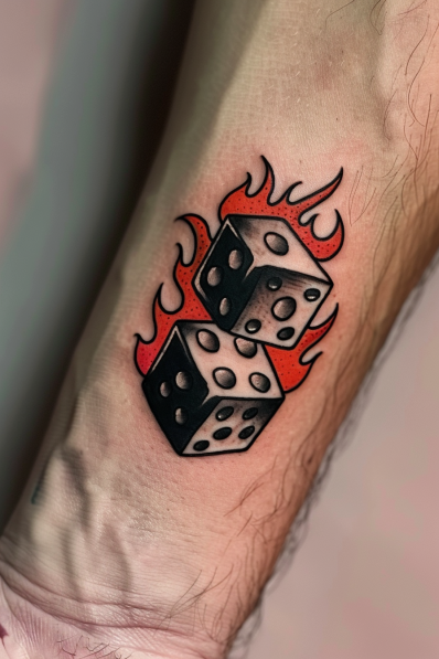 This bold tattoo features a pair of black dice engulfed in vibrant orange and red flames, giving off major high-stakes vibes. The dice are shaded with smooth gradients and bold black outlines, staying true to the old-school aesthetic, while the flames add a dynamic touch that makes the design come alive. The sharp edges of the dice contrast perfectly with the flowing, fiery flames, creating a visually balanced and energetic piece.