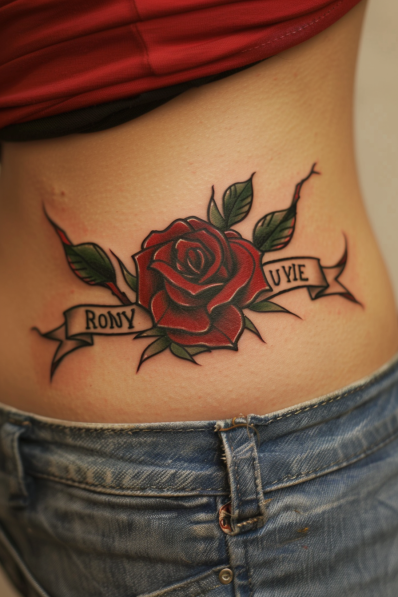 Why is this tattoo such a standout? Honestly, it s got that timeless appeal that never goes out of style. Roses are a tattoo classic for a reason they re elegant yet edgy. The design is both subtle and flirty, perfect for someone who wants a piece that s equal parts beautiful and badass. Plus, the names on the banners make it personal, like wearing a little piece of your heart (or maybe someone else s) right on your skin. Classic with a twist what s not to love?