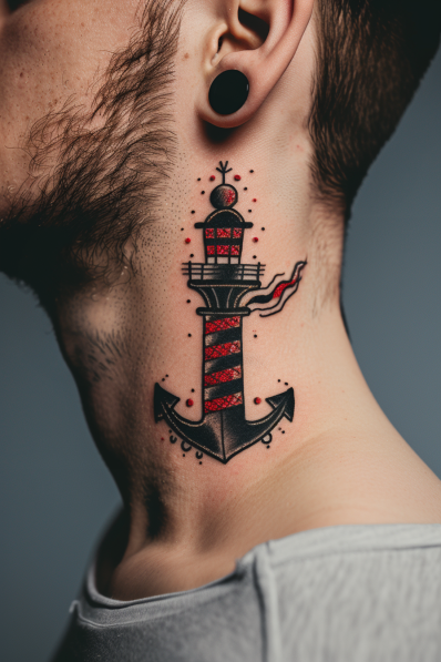 It s got a perfect mix of symbolism and style. The lighthouse represents guidance and hope, while the anchor adds a grounding element, making it a tattoo with a deep and balanced meaning. Plus, the red accents give it a pop of color that grabs attention without being over the top. It s the kind of design that feels classic yet fresh, perfect for anyone looking to wear a reminder of strength and direction in their life.