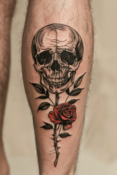 This tattoo masterfully combines the stark imagery of a human skull with the delicate beauty of a red rose. The skull features bold black shading and precise detailing, giving it a realistic yet classic old-school vibe. Below it, the rose stem runs vertically, adorned with sharp thorns and vivid green leaves, ending in a deep crimson bloom. The contrast between life and death in this design is striking, with the dark tones of the skull balancing the vibrant colors of the rose.