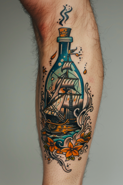This stunning tattoo captures the charm of a classic ship-in-a-bottle design, combining nostalgia with a sense of adventure. The intricate ship, with its billowing sails, floats inside a glass bottle surrounded by delicate water splashes and vibrant orange flowers. The bottle itself is shaded in blue and green tones, with a cork at the top and steam-like details rising, adding a whimsical touch. Bold outlines and rich colors give it a traditional old-school vibe, while the subtle gradients add depth and life to the piece.