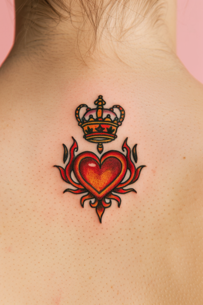 This bold and regal tattoo features a fiery red heart crowned with an ornate golden crown, exuding both passion and power. The heart glows with deep red and orange tones, outlined in bold black, giving it a traditional old-school style. Surrounding the heart are elegant black flames that add a touch of intensity and drama. The crown is finely detailed with rich gold accents and subtle hints of red and green jewels, making it the perfect symbol of royalty and devotion.