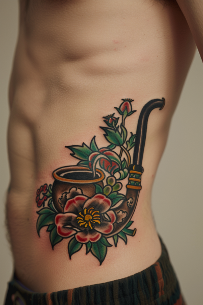 This elegant tattoo features a classic smoking pipe nestled among a vibrant arrangement of flowers and leaves, blending traditional design with artistic flair. The pipe is shaded in rich brown tones, with golden accents on the stem for a touch of sophistication. Surrounding it, the flowers burst with color, featuring deep reds, greens, and yellows, creating a lively yet balanced composition. The bold black outlines and smooth shading give it a timeless old-school aesthetic.