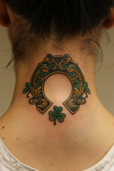 This tattoo combines a classic symbol of good luck the horseshoe with a touch of Irish charm in the form of vibrant green clovers. The horseshoe features intricate golden floral patterns, bordered by bold black outlines that make the design pop. The green clovers tucked around the horseshoe bring a fresh, lively contrast, adding a playful yet meaningful element. The placement and symmetry of the design give it a clean, balanced look that feels both bold and sophisticated.