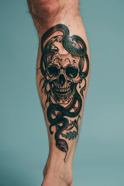 Why is this tattoo so captivating? It s got everything you want in a bold statement piece dark vibes, intricate artistry, and a whole lot of attitude. The skull represents mortality, while the snake adds layers of danger, rebirth, and mystery. Honestly, it feels like the kind of tattoo you get if you want people to stop and stare. The colors are sharp, the details are stunning, and the symbolism is packed with meaning. This is more than a tattoo; it s a whole mood.