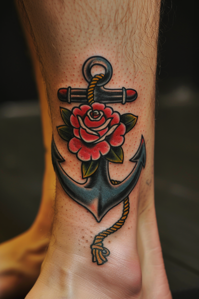This tattoo blends two timeless old-school symbols into one striking design: a sturdy anchor intertwined with a blooming red rose. The deep black of the anchor is contrasted beautifully by the vivid red petals and vibrant green leaves of the rose, while the rope detail wraps around the anchor with a touch of golden yellow. The bold outlines and clean shading make it a classic piece, with a subtle nod to maritime traditions and enduring love or stability.