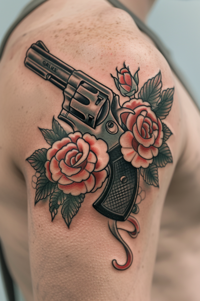 This bold tattoo pairs the rugged image of a classic revolver with the soft elegance of blooming roses. The gun is shaded with rich black tones and subtle highlights, showcasing its intricate details and a vintage design. Surrounding the revolver, the roses bloom in soft shades of pink and red, their petals beautifully contrasted by deep green leaves. The design is perfectly balanced, blending strength and beauty in a timeless old-school aesthetic.
