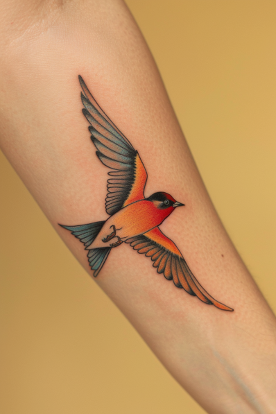 This vibrant sparrow tattoo takes flight on the forearm, featuring bold black outlines and warm, glowing shades of orange and red. The wings are spread wide with a gradient of soft blue on the tips, giving the design a sense of motion and freedom. The classic old-school anchor detail tucked subtly beneath the tail nods to the tattoo s roots in traditional sailor symbolism. Its clean lines and striking colors make it pop against the skin, perfectly embodying that vintage tattoo vibe.