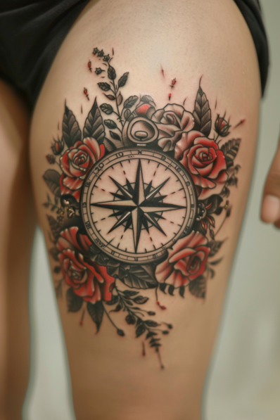 This tattoo brings together the timeless elegance of a compass with the romantic charm of roses, creating a perfect balance of direction and beauty. The compass is shaded in intricate black and gray, featuring bold lines and a classic starburst design. Surrounding it, rich red roses bloom amidst dark green leaves and fine vine details, adding depth and vibrancy. The soft red splatters in the background give the piece a slightly edgy, dramatic feel, tying everything together with an old-school aesthetic.