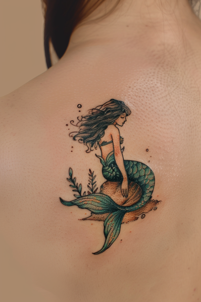 Why do I think this tattoo is enchanting? It s got that perfect balance of fantasy and artistry. The mermaid s calm pose and intricate details create a story on your skin, while the classic coloring keeps it rooted in old-school charm. It s the kind of tattoo that feels magical without being over-the-top. If you re into mythical creatures and a touch of the sea s mystery, this design is definitely making waves!