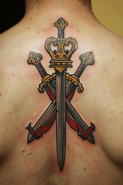 Why do I think this tattoo is impressive? It s like wearing your inner warrior on your back literally. The combination of the crown and swords symbolizes leadership, resilience, and a fighting spirit, making it a statement piece for anyone who embraces those values. Plus, the craftsmanship is on point, with the gold and red hues complementing each other beautifully. This one feels like a badge of honor, perfect for someone who s ready to rule their world (or at least look like they do).