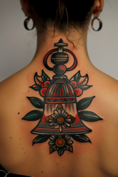 Why do I think this tattoo is so striking? It s a classic piece that combines symbolism and beauty. The bell often represents celebration, harmony, or even a calling, while the flowers add warmth and life to the design. The contrasting elements work together effortlessly, making it a bold and meaningful tattoo. It s the kind of design that turns heads and starts conversations a timeless, artistic statement for anyone who loves traditional ink with a touch of elegance.