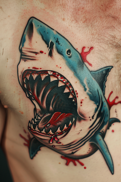 This jaw-dropping tattoo showcases a ferocious great white shark leaping forward with its mouth wide open, exposing sharp, detailed teeth and a blood-red tongue. The shark s body features bold blue-gray tones, accented by clean black outlines that give it a striking old-school flair. Red splashes of blood around the design add an extra dose of drama, giving the tattoo a raw and dynamic energy. It s a bold piece that feels alive with motion, perfectly capturing the predator s power and intensity.