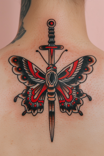 This striking tattoo merges the delicate beauty of a butterfly with the sharp intensity of a dagger. The butterfly s wings are adorned with bold black and red patterns, giving it a vibrant, old-school aesthetic, while the dagger pierces straight through the center, adding an edgy and dramatic twist. The clean lines and balanced symmetry make this design pop, with the dagger s handle and blade featuring classic detailing that complements the wings intricate patterns.