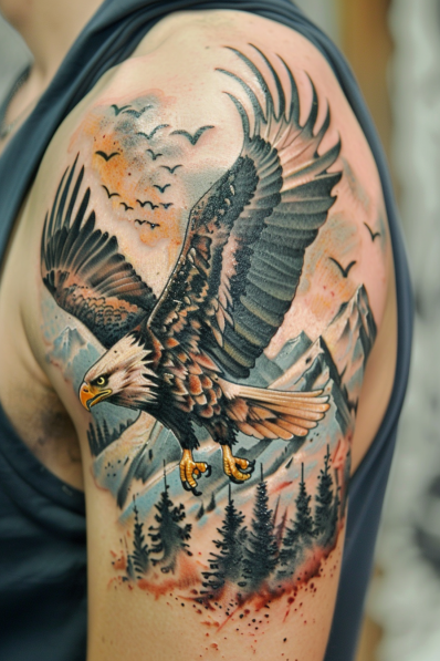 This striking shoulder tattoo features a soaring eagle in all its glory, capturing the essence of freedom and strength. The eagle s wingspan dominates the upper arm, with meticulously detailed feathers that fade from rich black to soft gray. Its talons are poised mid-flight, and the sharp yellow beak pops against the moody tones. Behind the eagle, a dramatic mountain range sets the scene, while a flock of birds and a warm sunset sky add depth and movement to the design. The inclusion of pine trees in the foreground ties it all together, giving it a rugged and adventurous feel.