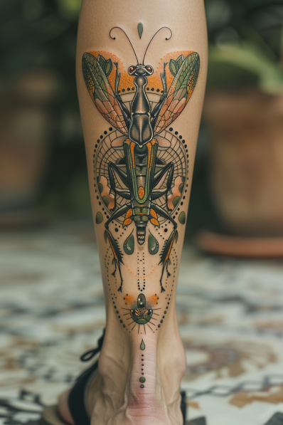 This tattoo takes the praying mantis to the next level by incorporating geometric and mandala-inspired elements into the design. The mantis is highly detailed, with vibrant greens and oranges that make it pop against the skin. Surrounding the insect is an intricate mandala pattern, perfectly aligned with its body, adding a layer of symmetry and balance to the tattoo. The dot work and subtle shading tie everything together, creating a mesmerizing visual effect that blends nature and geometry into one stunning piece.