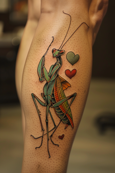 This tattoo combines a beautifully detailed praying mantis with simple heart accents, creating a unique blend of nature and love. The mantis is inked in vibrant greens and oranges, with sleek, defined lines that give it a sharp, modern look. Above and around the mantis are three hearts in red and green, adding a playful and romantic touch to the design. The hearts soften the insect s bold appearance, creating a fun contrast between the natural and the whimsical.