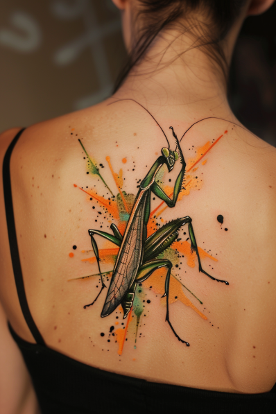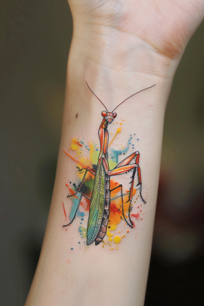 Watercolor Praying Mantis Tattoo with Vibrant Splash