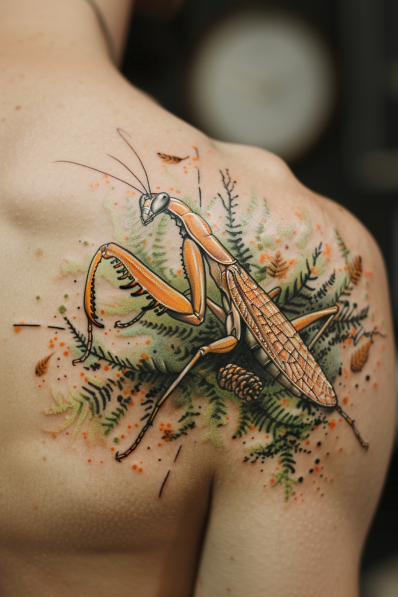 Woodland Praying Mantis Tattoo with Pinecone and Fern Details