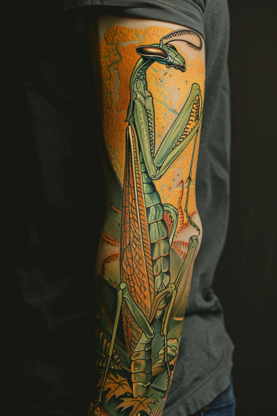 This tattoo is a bold masterpiece, featuring a towering praying mantis set against a warm, desert-like backdrop. The mantis is depicted in a striking green with an elongated, almost exaggerated body. The orange-toned background gives off a rugged, wild vibe, making it feel like the mantis is lurking in a hot, dry landscape. The fine details in the insect s wings, body segments, and surrounding foliage create a truly dynamic scene, as if you re looking at a mantis straight out of nature s fiercest environments.
