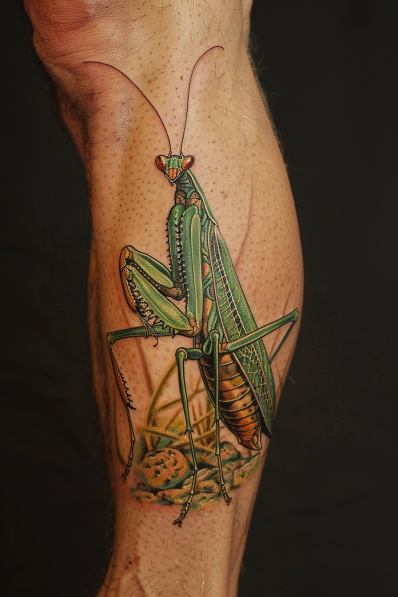 This tattoo showcases an impressively realistic praying mantis with a bold, almost 3D-like effect. The mantis appears to be perched on the skin, with its big, captivating eyes and detailed legs making it seem ready to move. The colors are vibrant, with shades of green, brown, and soft iridescent tones in the eyes that add a lifelike touch to the design. The shading and highlights are expertly done, creating a sense of depth and dimension that makes the mantis feel like it s popping off the skin.