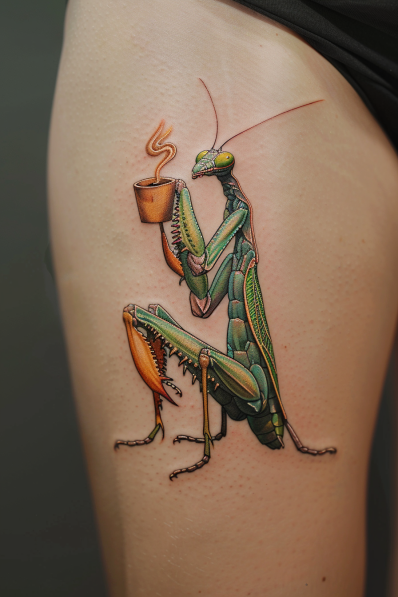 This tattoo showcases a fun and laid-back praying mantis enjoying a cup of coffee! The mantis is depicted in detailed green and orange tones, sitting upright and holding a steaming cup. The realistic shading makes the insect look lifelike, but the playful addition of the coffee cup adds a humorous twist to the design.