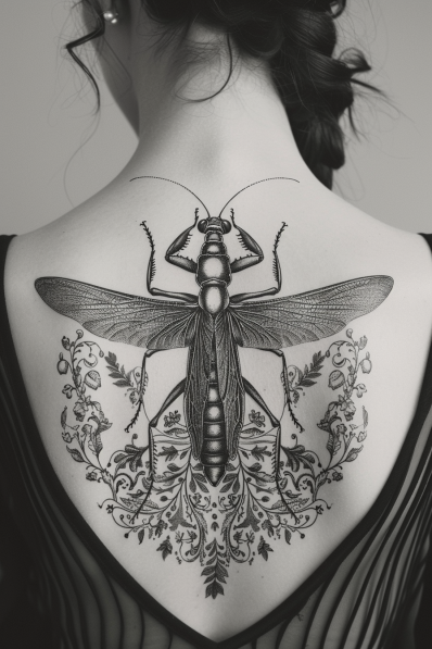 This tattoo is a stunningly intricate depiction of a praying mantis, beautifully detailed in black and gray ink. The mantis is spread across the upper back, with its wings open wide, showing off its delicate, detailed lines. Beneath the insect, elegant floral patterns curl and twist, adding an ornamental touch to the design. The tattoo feels both natural and artistic, blending the sharp, almost mechanical form of the mantis with the softness of the floral elements, creating an incredibly balanced and striking piece.