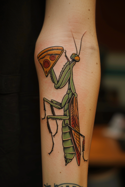 Quirky Praying Mantis Tattoo with Pizza Slice
