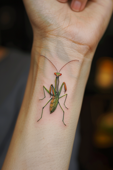 I think this tattoo is absolutely charming! The minimal approach makes it feel so light and refined, while the subtle pops of color give it just the right amount of personality. I love how it s small but still manages to capture all the unique details of a praying mantis without going overboard. This is the perfect choice for anyone looking for a simple yet meaningful design that carries an air of elegance and modernity. Plus, it s great for someone who loves nature but wants to keep things on the subtle side!